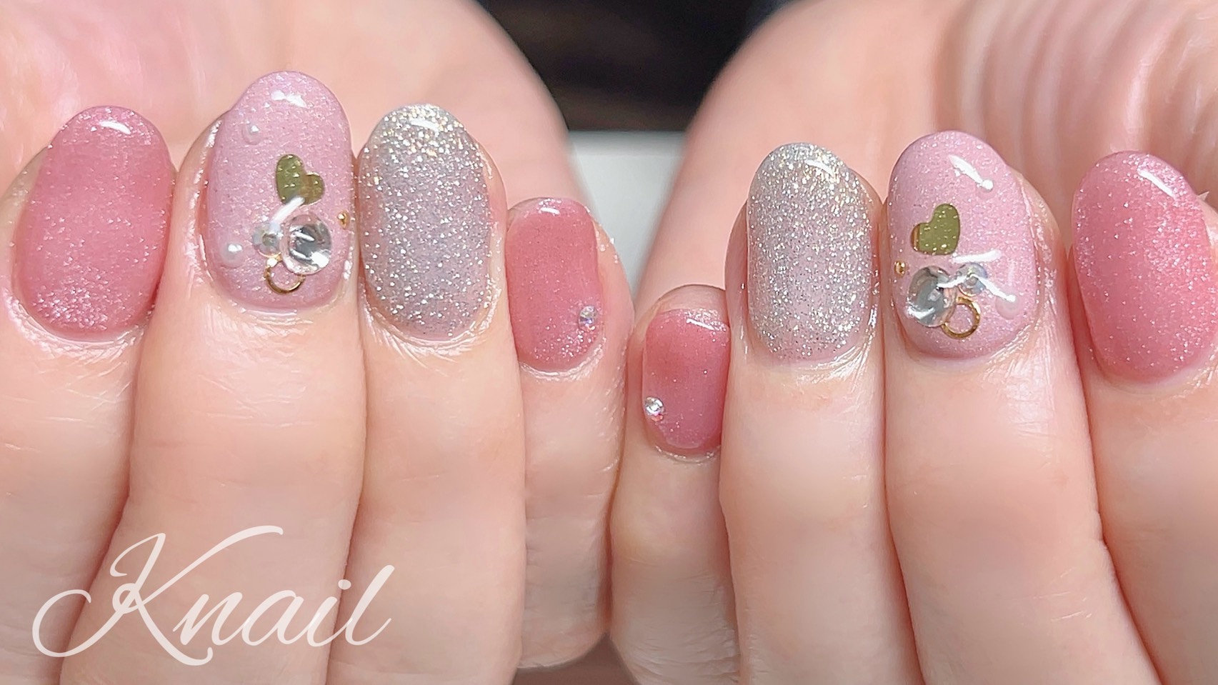 質感の違うピンクでマグネットとフラッシュをミックスし、小さなハートとストーンで遊び心をプラスしたバレンタインネイルになりました♪