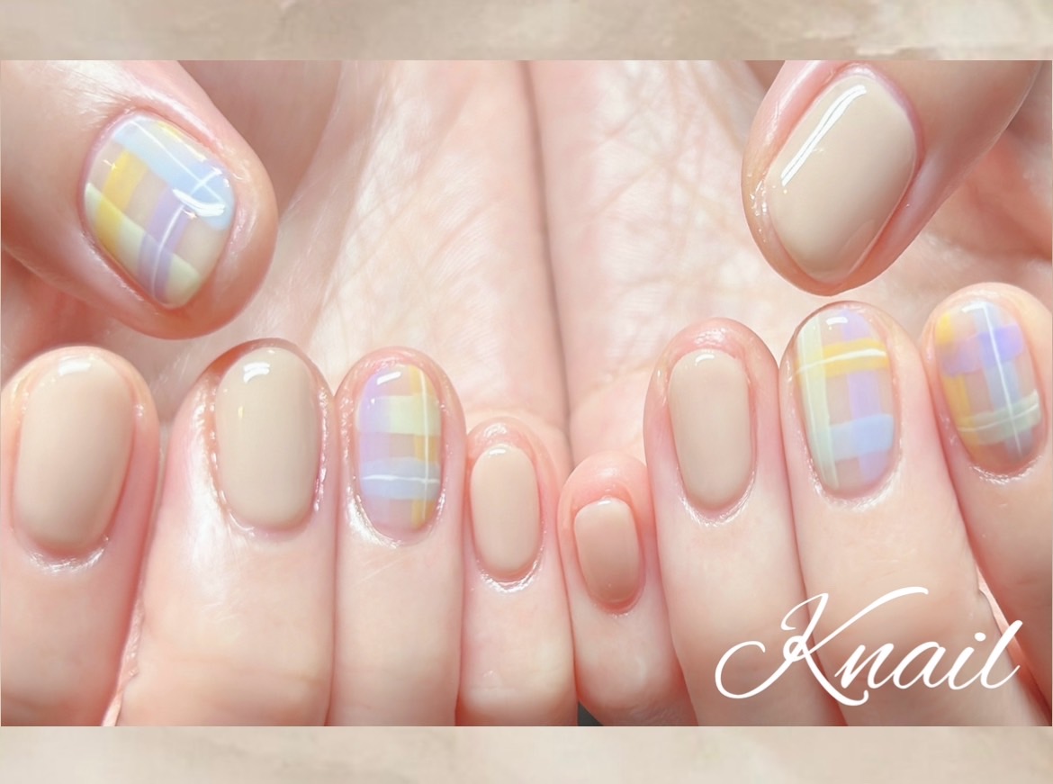 ナチュラルカラーにやわらかいパステルカラーのチェックデザインをされました♪