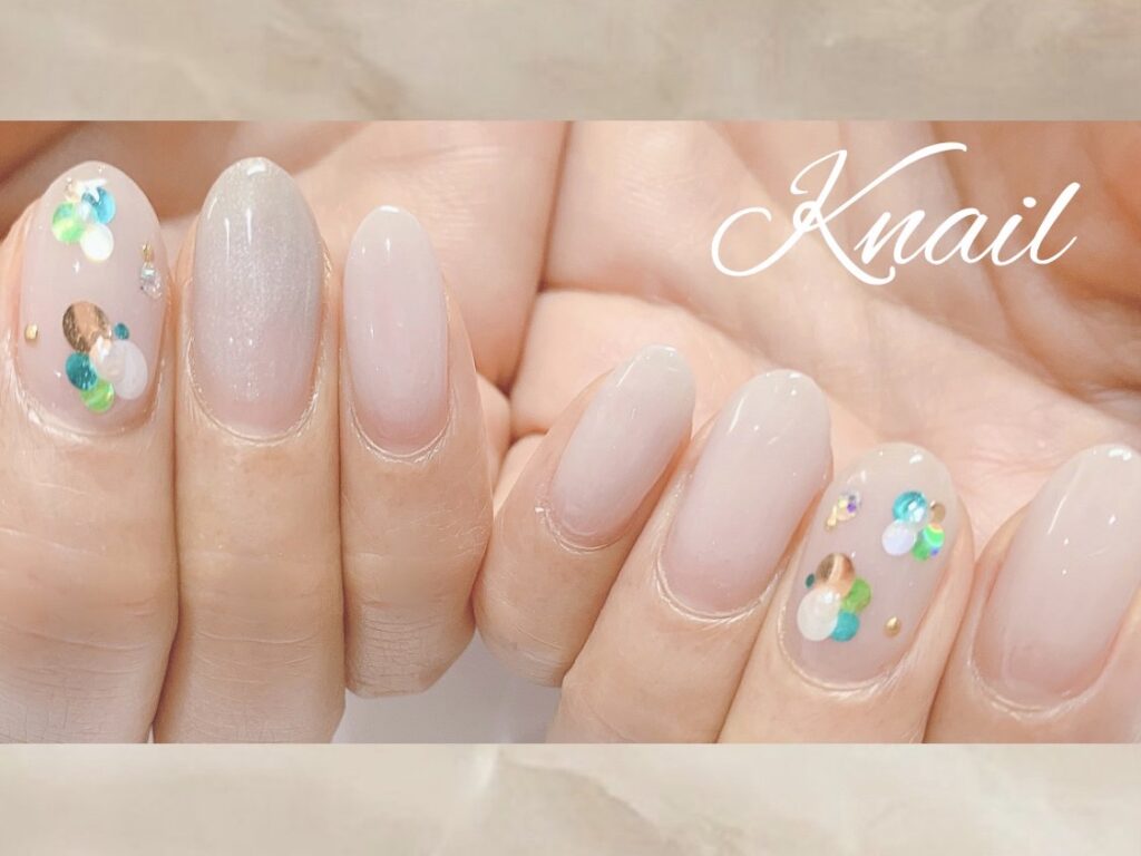 ナチュラル系カラーにグリーン系のホロフラワーアートをして大人可愛いネイルになりました♪