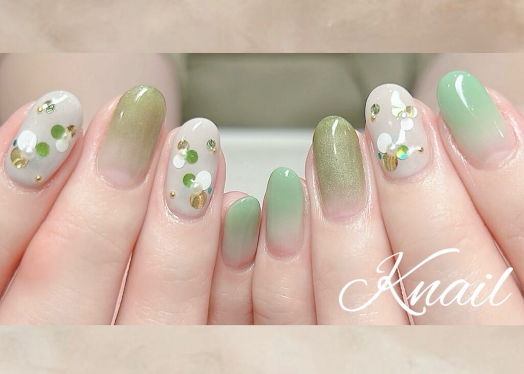 グリーンで統一した可愛いネイルになりました♪