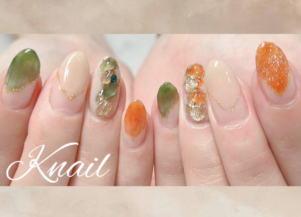 少し落ち着いたグリーンマグネットとオレンジマグネットのアシンメトリーネイルとっても可愛いです♪