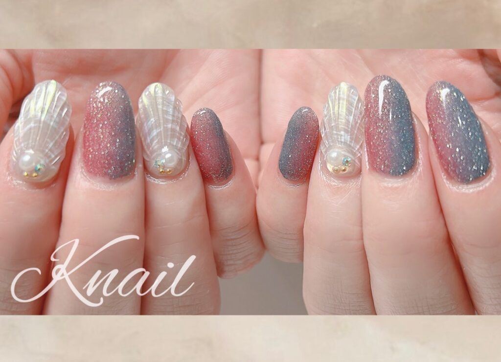 華やかなフラッシュジェルの縦グラデーションをマーメイドシェルのデザインに合わせてキラキラの可愛い華やかなネイルになりました♪