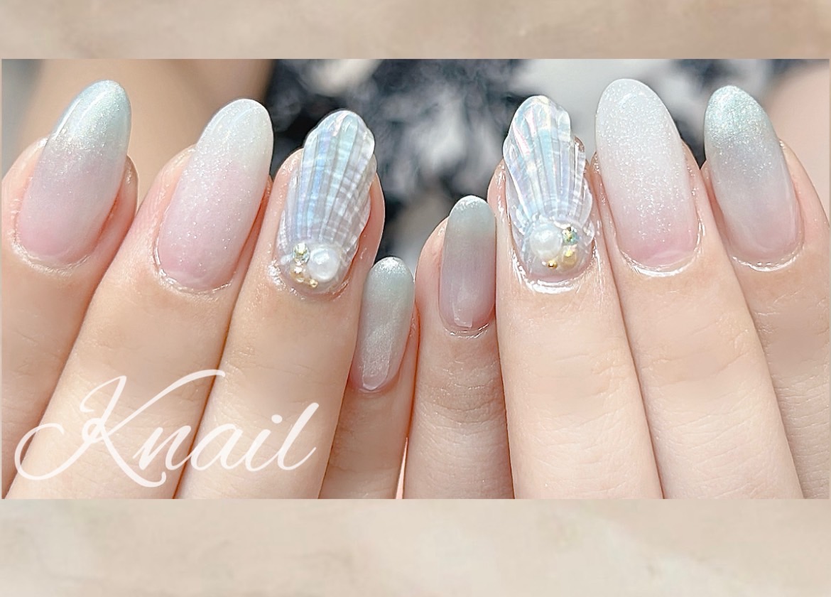 キラキラカラーのグラデーションとマーメイドシェルの組み合わせで涼しげで素敵なネイルになりました♪