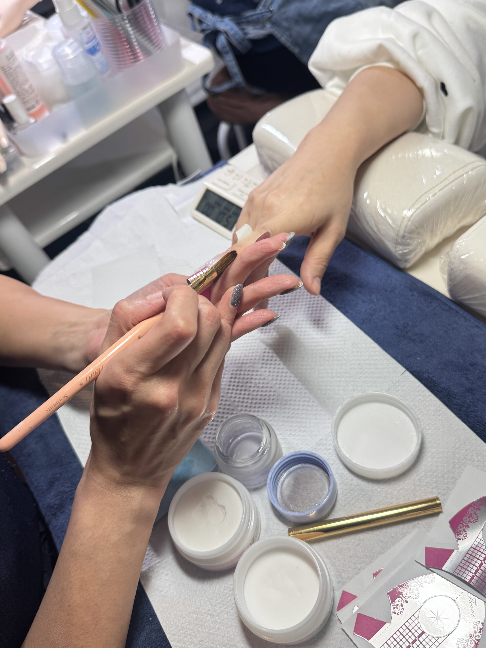 モデルさんの手をお借りして、スカルプチュア(長さ出し)の練習を行いました💅