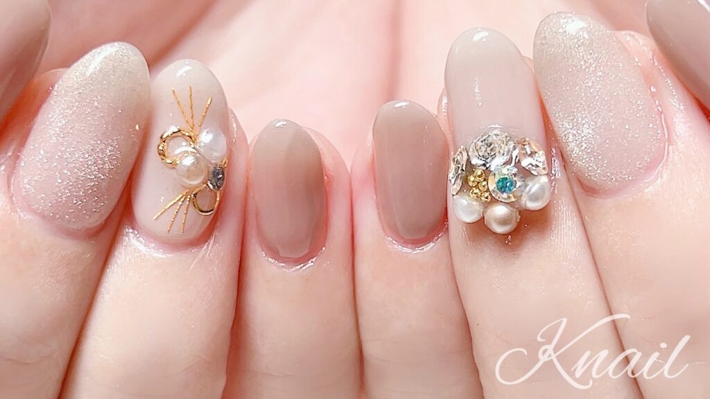 水引をイメージした上品な和の雰囲気と、パッと目を引くビジューの華やかさが絶妙に調和した、大人華やかネイルです♪