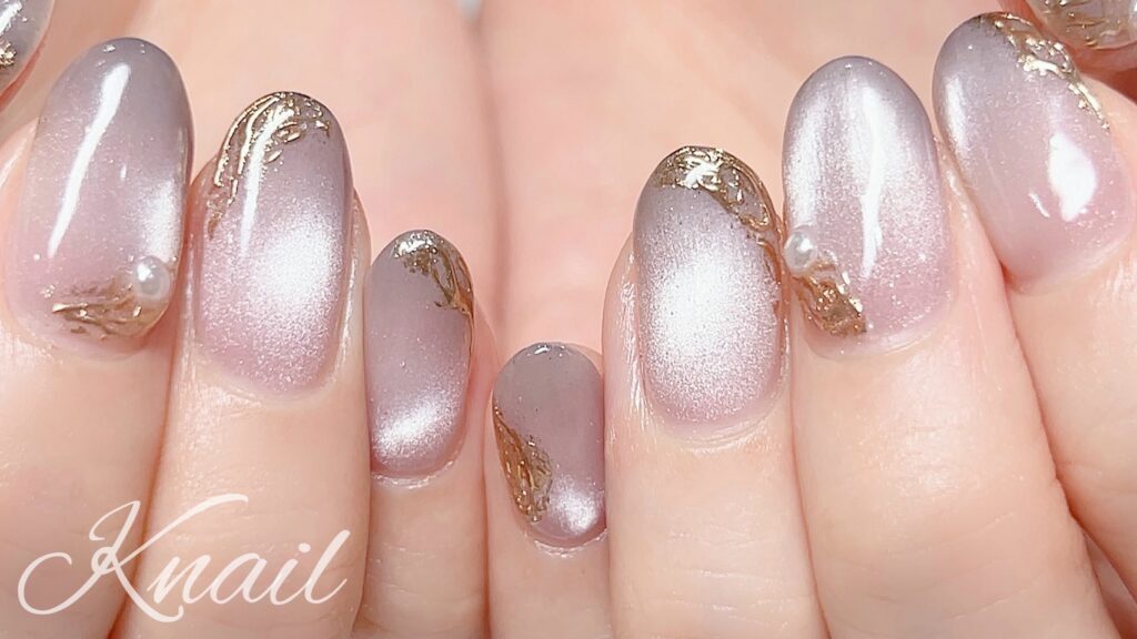グレージュカラーの繊細なマグネットにブルーグレーカラーのグラデを先端に追加した透明感あふれるデザインです♪