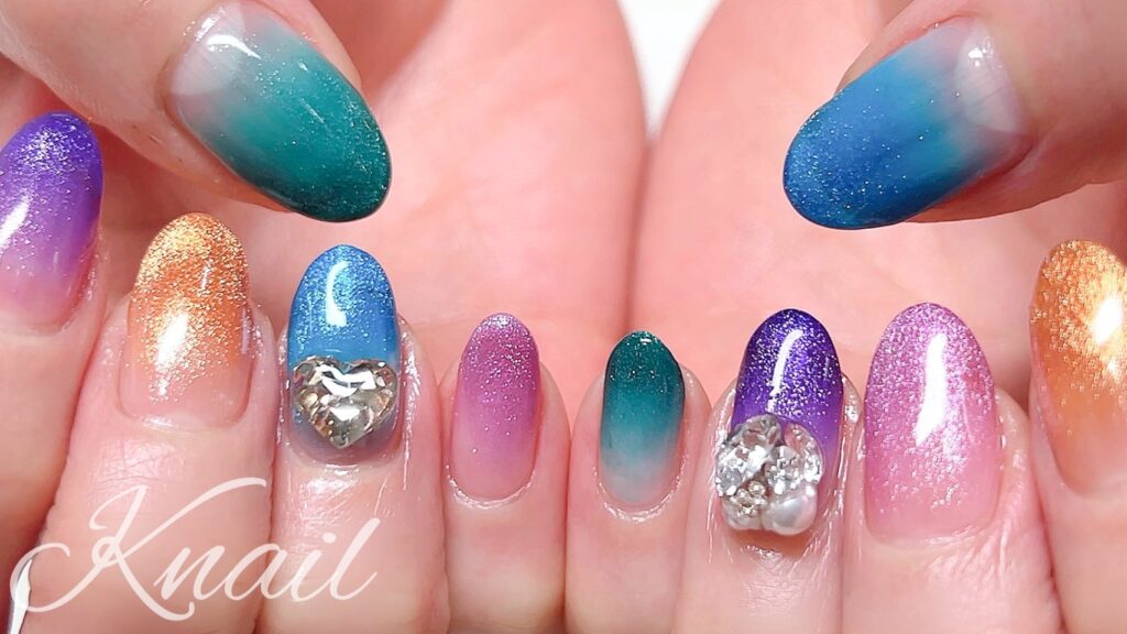 カラフルなマグネットにハートのキラキラパーツとビジューをつけて華やかネイルの完成です♪