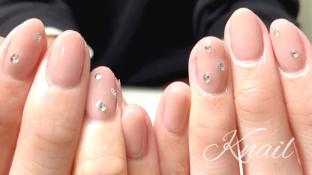 肌馴染み良いナチュラルカラーのグラデーションにランダムにストーンアートをしてワンランク上のシンプルネイルになりました♪