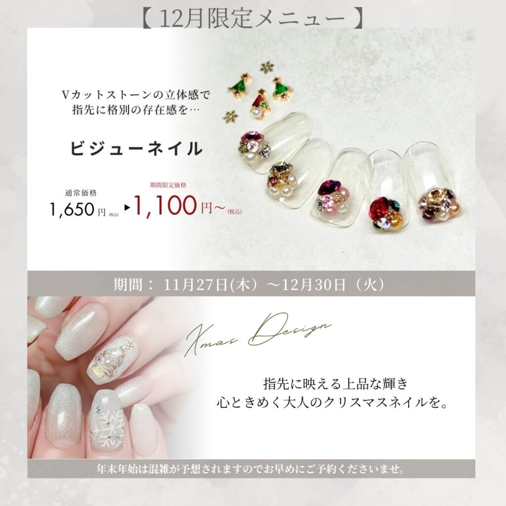 この度、お客様からご要望の多いVカットストーンを使ったビジューネイルを、普段よりお得にご利用いただける期間限定のメニューとしてご用意いたしました(^人^)♪