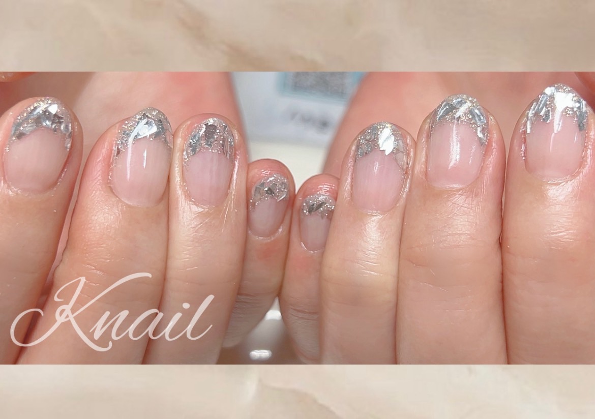 シルバーのフラッシュジェルをフレンチし、シルバーの乱切りホロを敷き詰めてガラスフレンチにしました(^^)♪