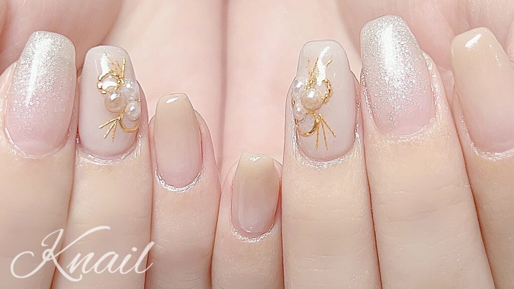 ふんわりと優しい乳白色のベースに、ゴールドの曲線とパールで「水引」をイメージしたアートを施しました。
