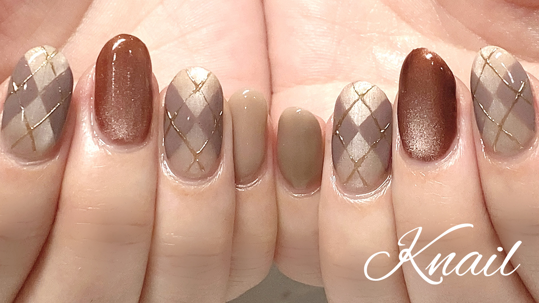 マグネット、ミラーなどトレンドを織り込んだアーガイルが大人かわいいネイルにしてくれます♪
