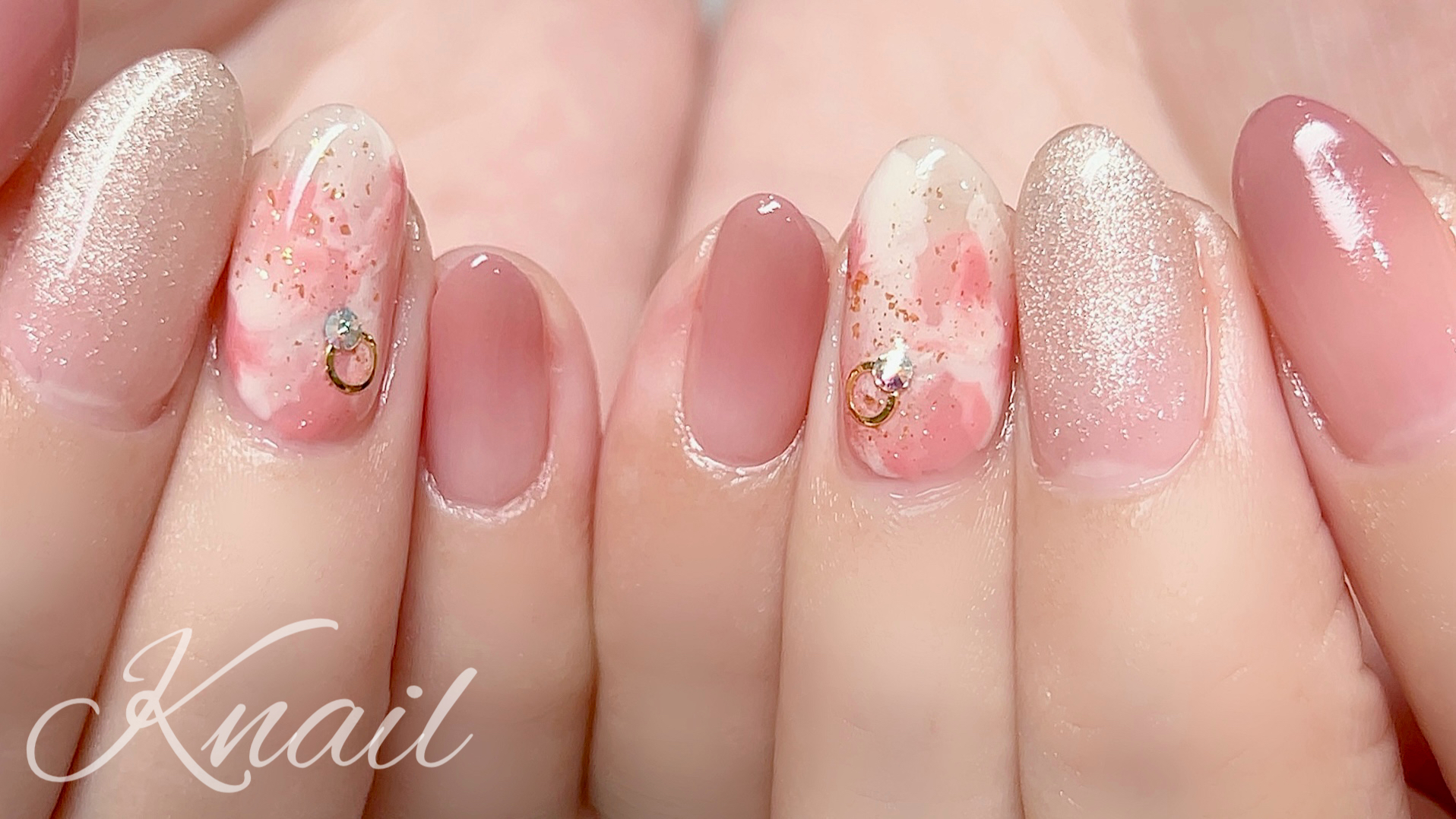 春を感じるふんわりとしたグラデーション花風ニュアンスにゴールドとストーンをのせ女性らしい華やかなデザインになりました!