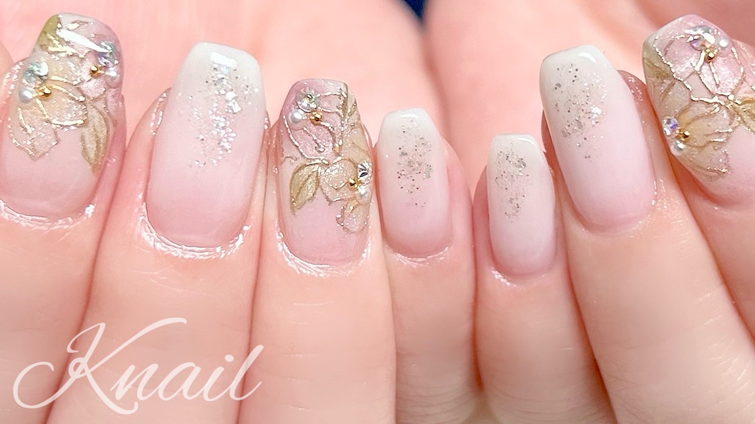 淡いカラーのグラデーションに、手描きのマグネットフラワーアートとパールを贅沢にあしらったデザインです♪