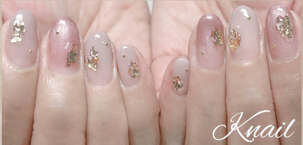 グレージュとピンクのマグネットのグラデーションに金箔ぷっくりアートとスタッズが散りばめられた洗練されたデザインです♪