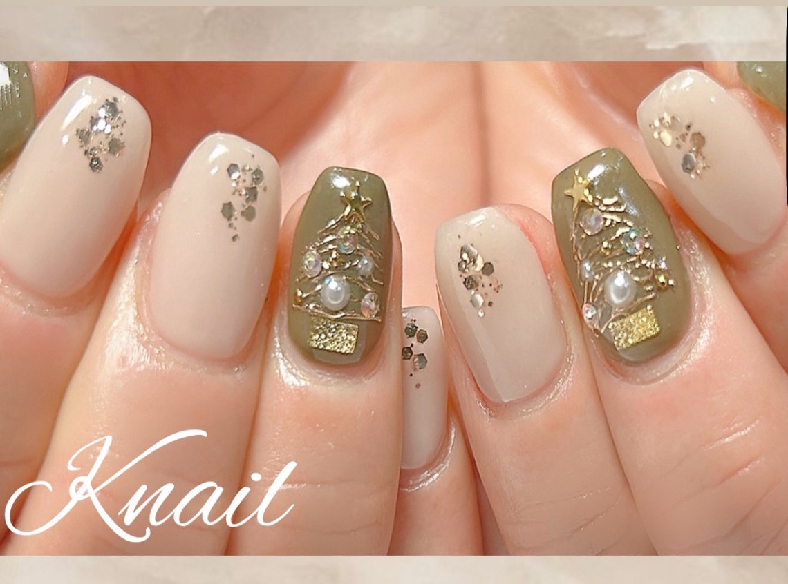 ミラーのツリーにストーンやパールでツリーを飾り大人な雰囲気で素敵なXmasネイルになりました♪